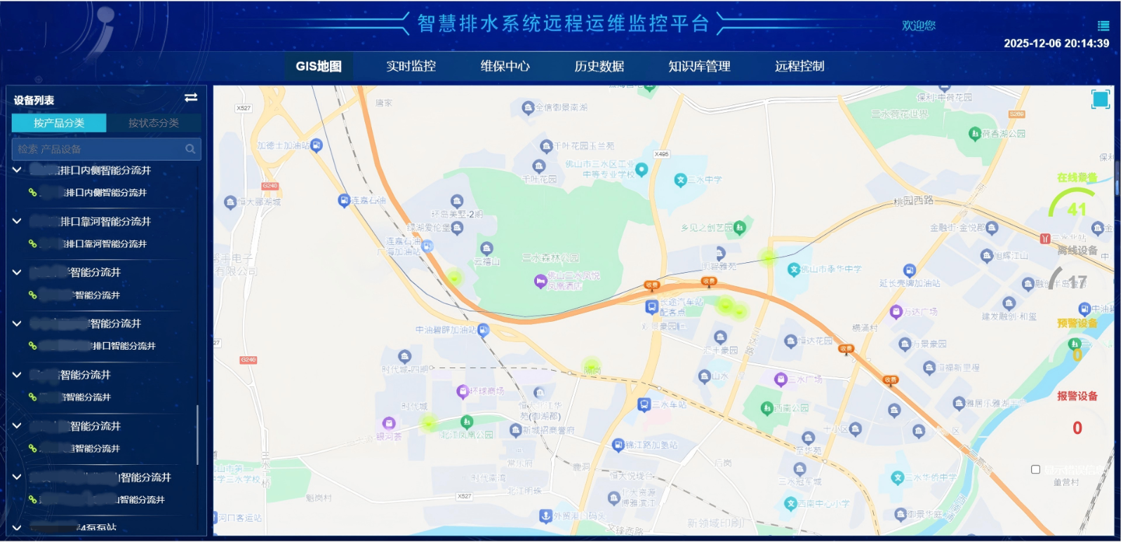 全域感知:GIS一张图可视化,实时监测记录管网运行数据并分析,实现截流调蓄运行数据在线,便于排水系统管理,提升排水系统的运行效率